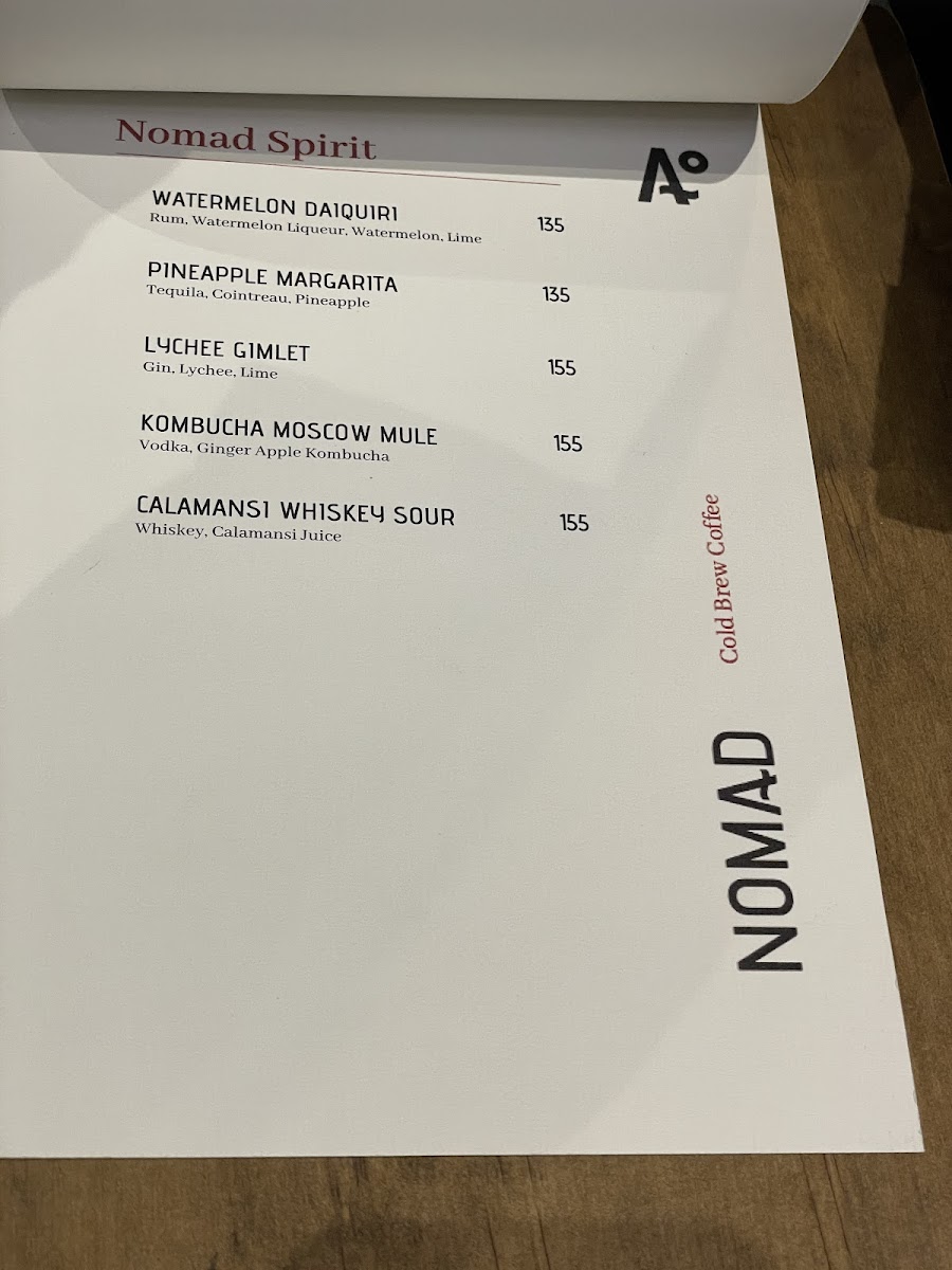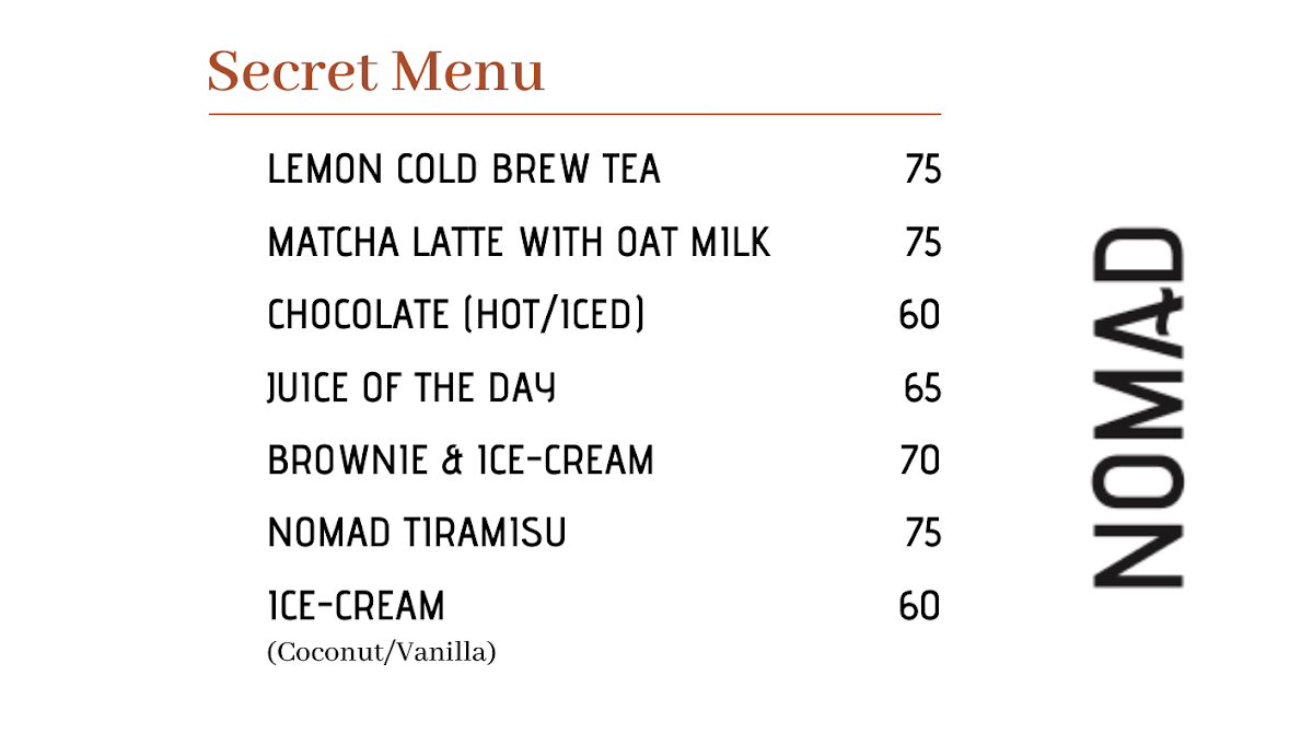 This menu fits well with NOMAD’s serene and somewhat hidden atmosphere, inviting guests to relax and unwind quietly—whether catching up on reading, working, or simply pausing during a busy day. The selection suits those who value both comfort and a touch of creativity in their coffee experience.